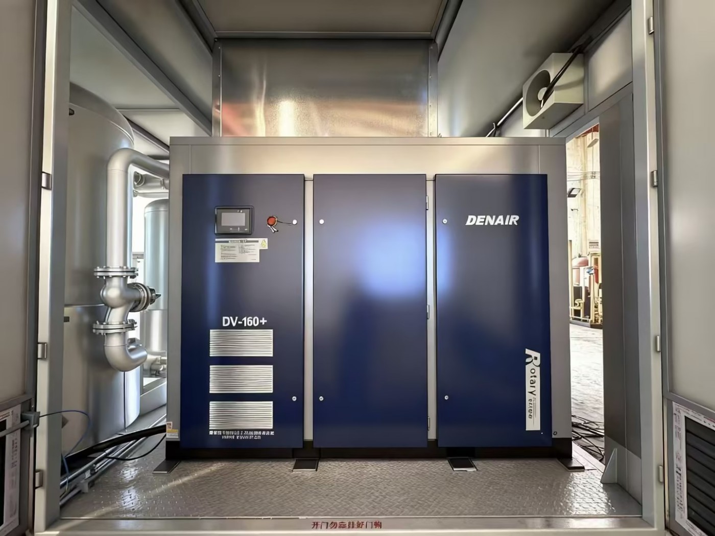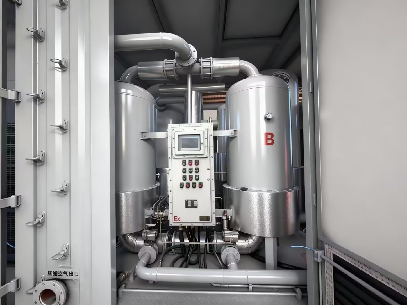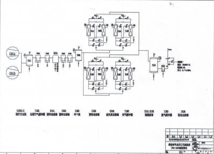 首先,环境空气经喷油螺杆空压机压缩后进入压缩空气缓冲罐进行粗脱水和压力缓冲,得到满足制氮机消耗的压缩空气。